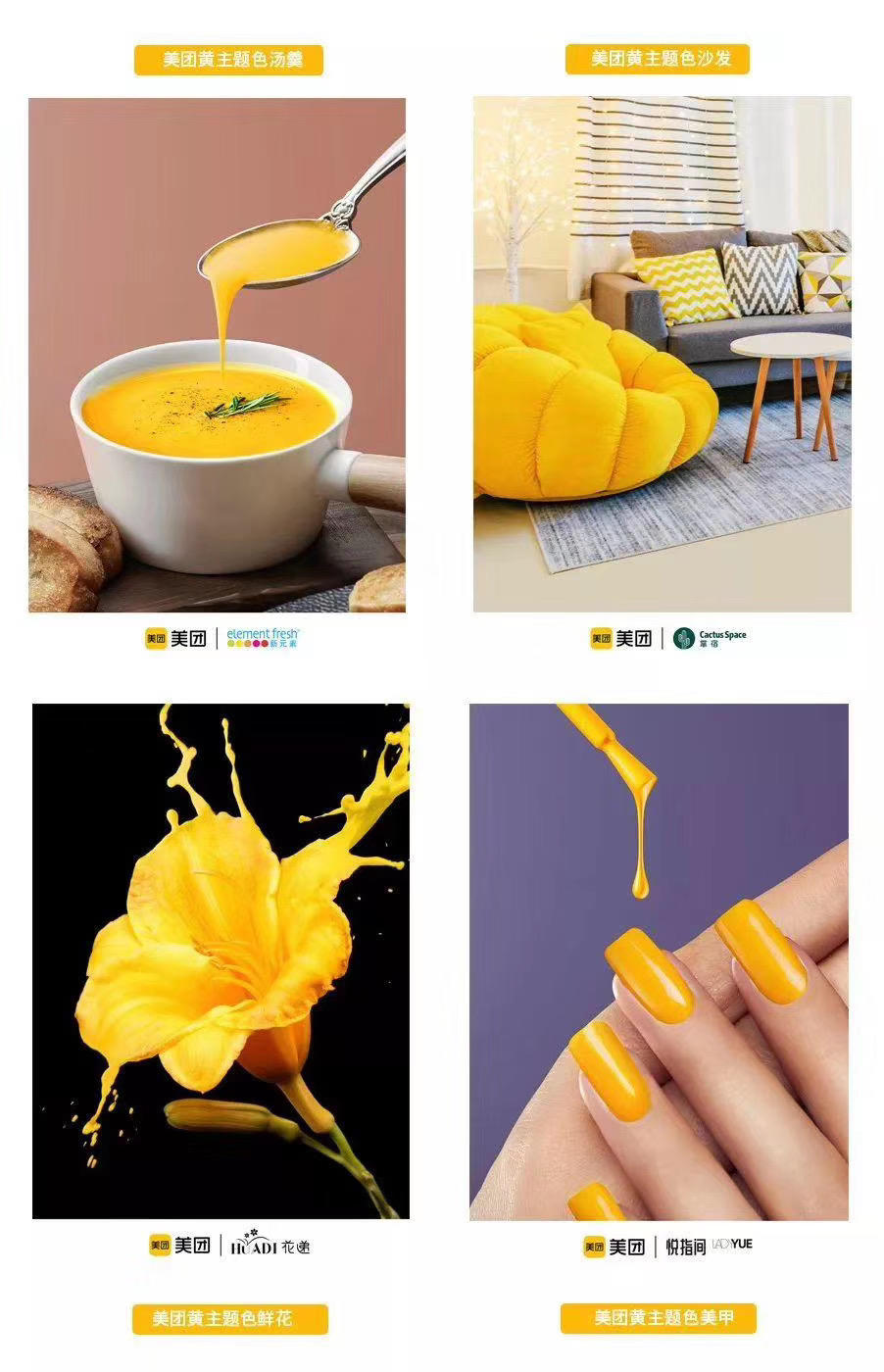 研究所表明,色彩的占领,在人们的品牌认知和消费行为上有着重要意义。对于一个品牌形象来说,利用颜色来吸引消费者、传递品牌精神、表达品牌文化,是直击人心的手法。美团品牌色战略升级,选用的这个明亮、温暖而略带橙色色感的黄色作为全新的品牌色,传递了“温暖、活力、热情”的品牌形象。